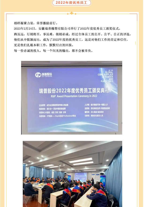 董事長對各部門、子公司負責人的2022年度總結(jié)及2023年度工作規(guī)劃進行分析,對大家疫情期間的工作予以肯定,并對其薄弱與不足之處提出改進意見。2023年公司將圍繞開拓新市場、項目管理制度、事業(yè)部智能化制造、員工工作能力、公司管理制度等方面進行提升。努力為員工提供更好的福利待遇,為客戶提供更優(yōu)質(zhì)的服務(wù),為實現(xiàn)瑞普成為全球橡塑零部件核心供應(yīng)商的企業(yè)愿景而不懈努力!